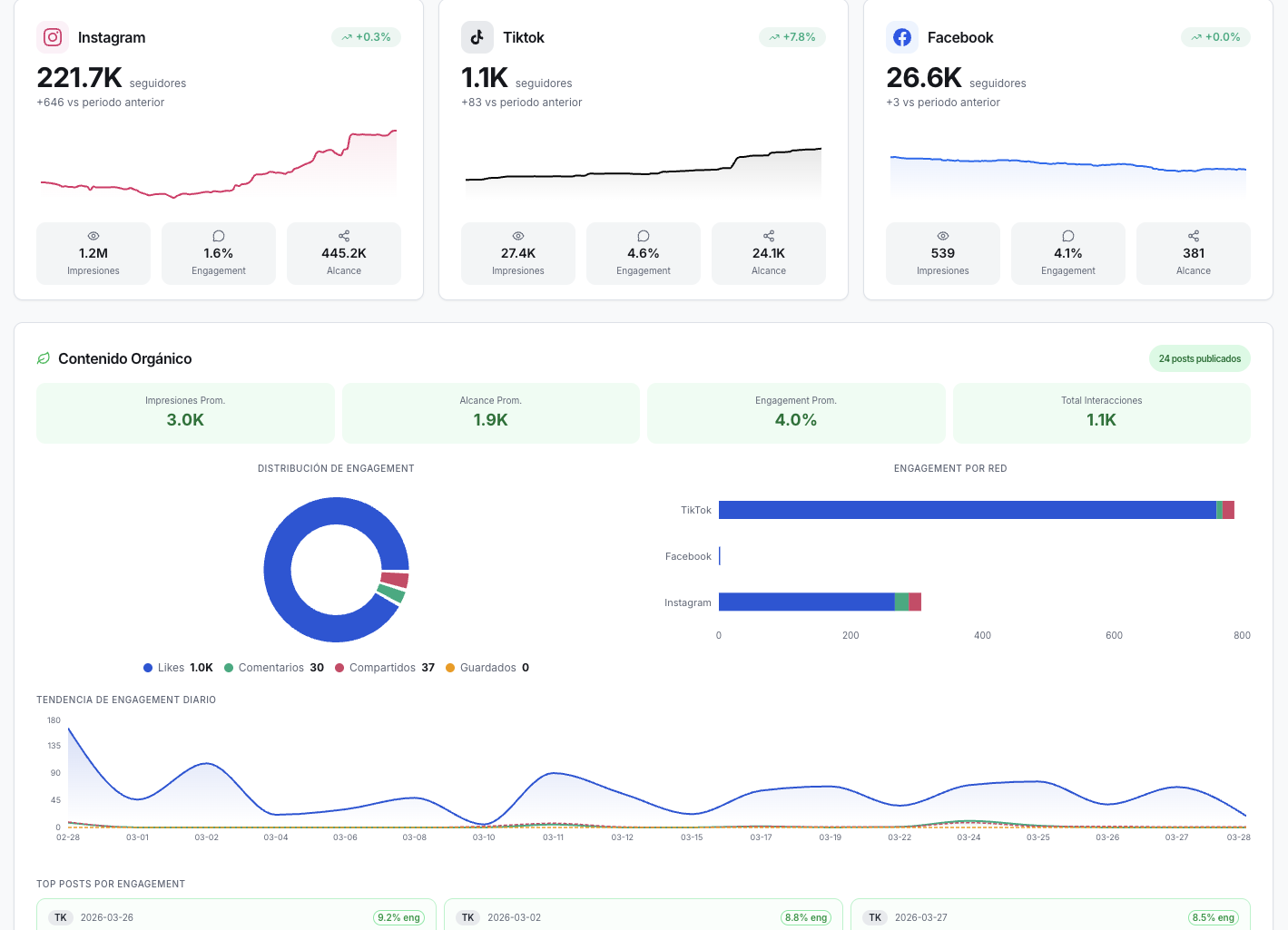 - Redes sociales (seguidores, alcance, engagement)
