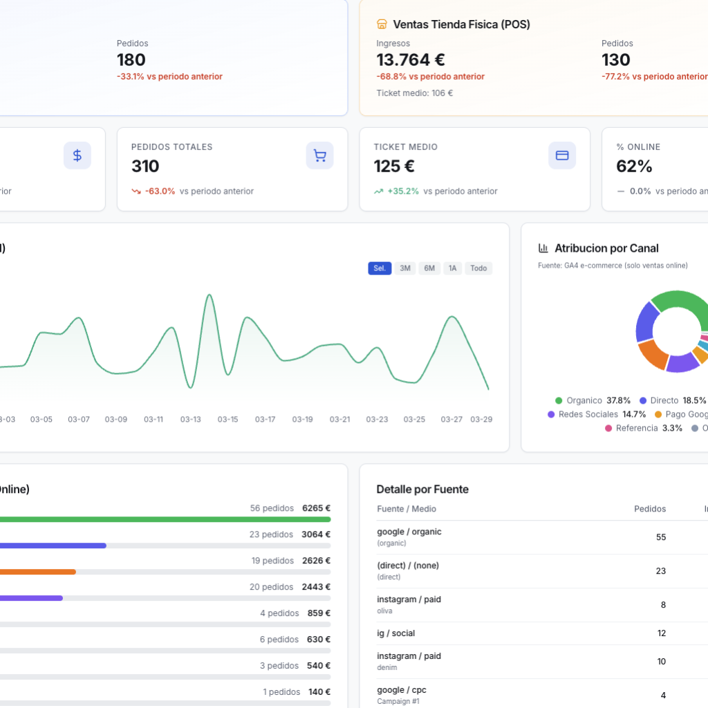 - E-commerce (ingresos, pedidos, ticket medio, productos top)